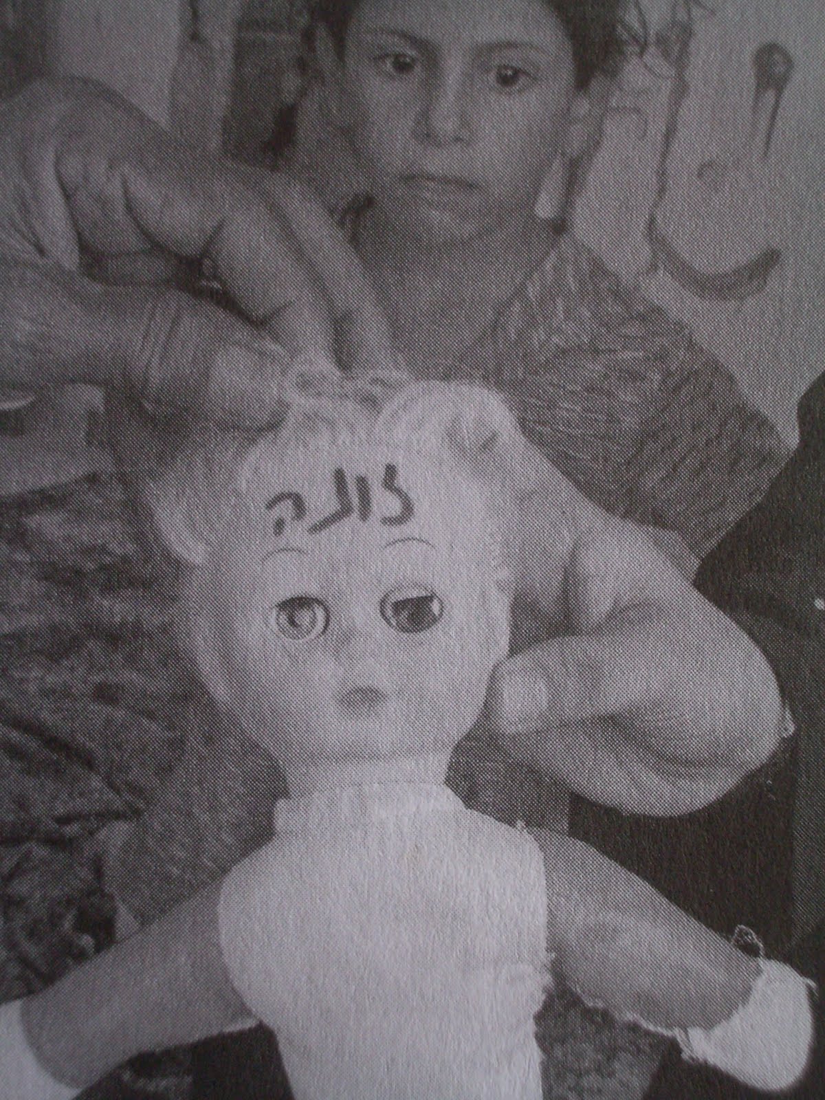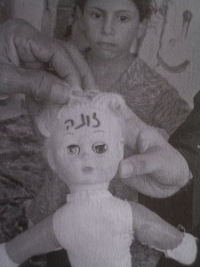 Palestinian child looks in horror at her doll vandalized by soldiers