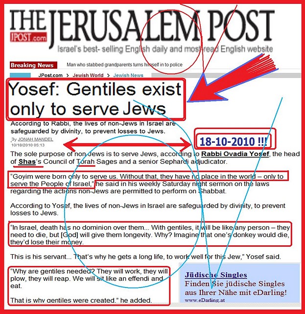 The persons who resort to accusation, suppression, character assassination and smear campaign very cunningly and dishonestly omit to mention that those who expose and condemn the racist concepts of “chosen-ness”, “exceptionality”, “superior morality”, “superior intelligence”, and “Jewish entitlement of world leadership” do not invent these concepts. It is not racist to expose or quote such abomination, it is not a crime to bring such Jewish-claims to the public awareness. Any honest criticism should be directed against those who believe such filth and make such revolting claims.