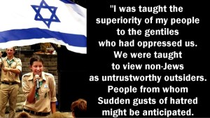 More tacitly and subconsciously, I was taught the superiority of my people to the gentiles who had oppressed us. We were taught to view non-Jews as untrustworthy outsiders, people from whom sudden gusts of hatred might be anticipated, people less sensitive, intelligent, and moral than ourselves. We were also taught that the lesson of our dark history is that we could rely on no one.”